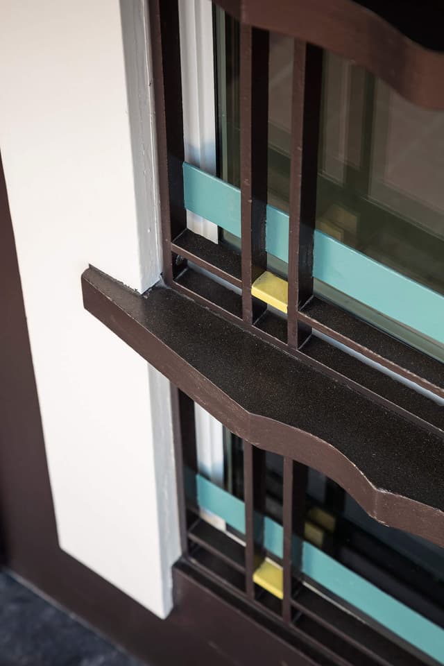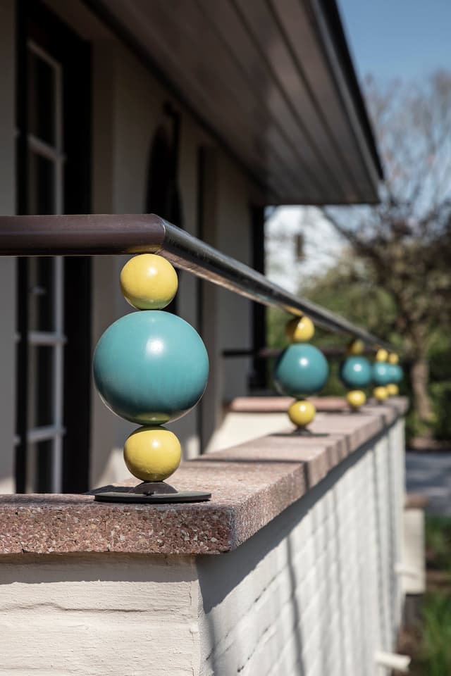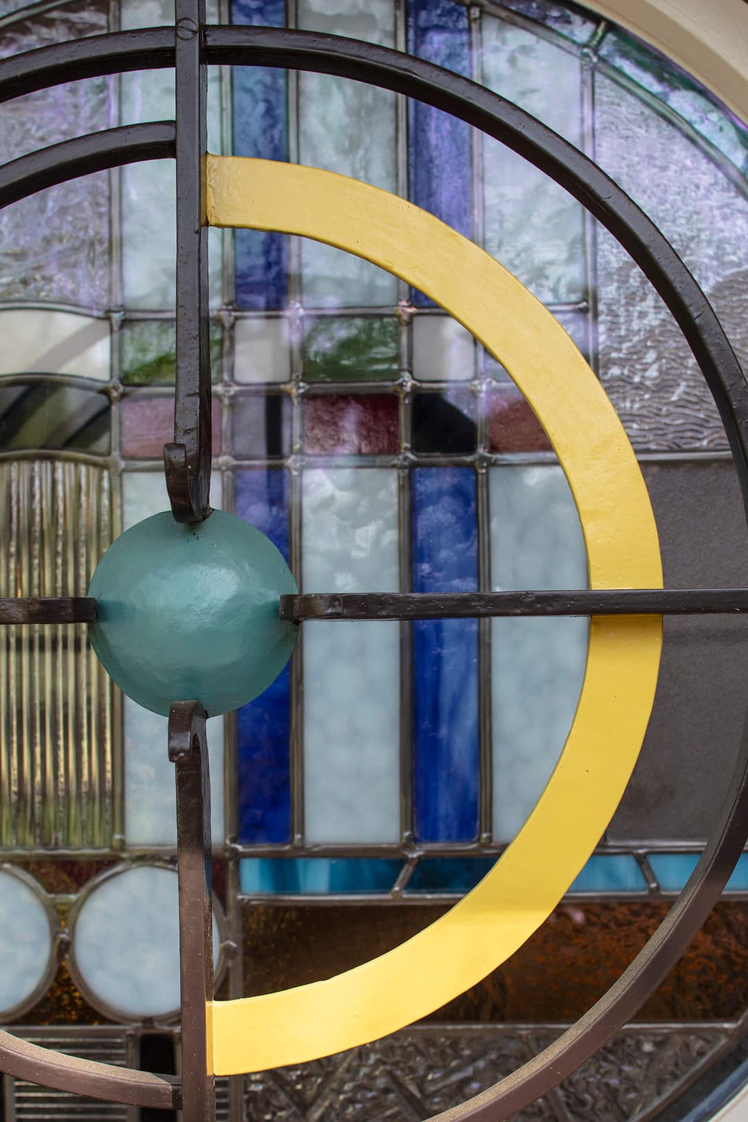 Van een afstand bezien, lijkt het kleurenpalet van deze villa behoorlijk homogeen. Maar kom dichterbij en ontdek kleuren als mosterdgeel, het turquoise en het chocoladebruin en roze. Die komen terug in accenten, randen, smeedwerk, glazuren elementen, kozijnen en glas-in-lood ramen. Al deze kleuren zijn teruggebracht tijdens de renovatie.