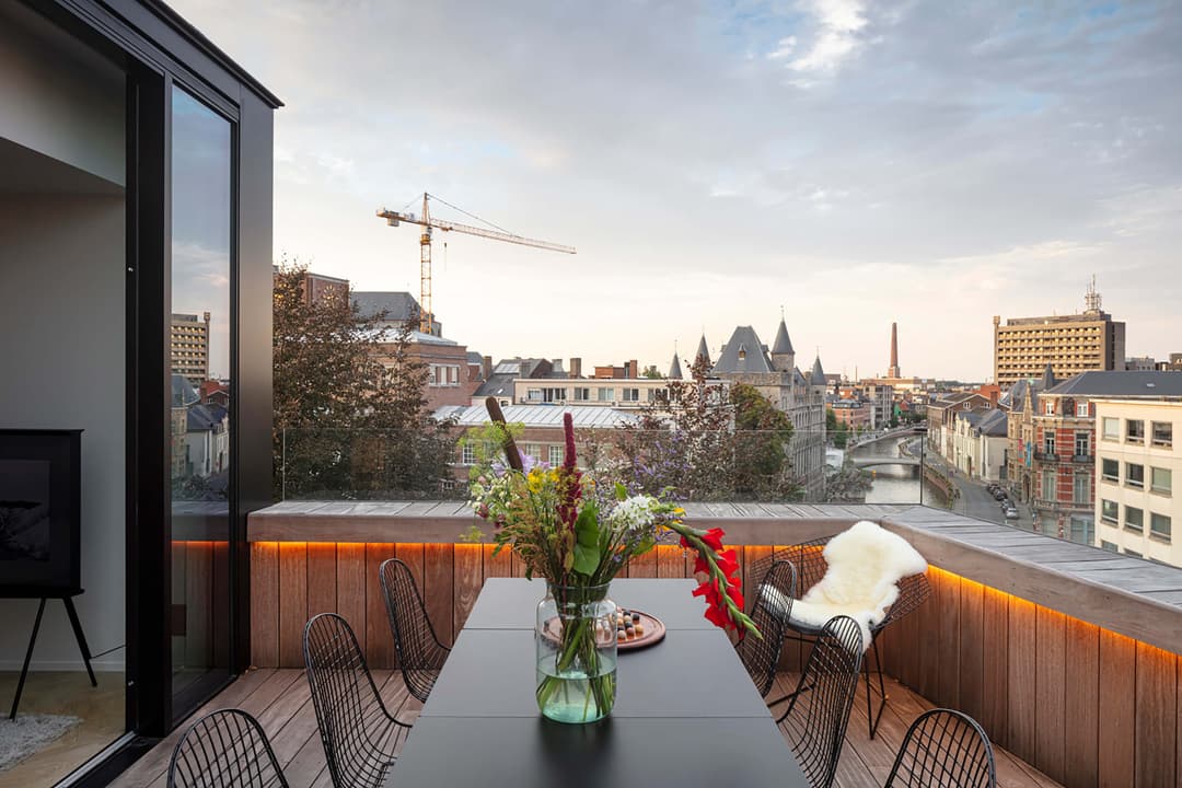 ‘Het huis werd in 1890 gebouwd door de burgemeester van Ledeberg, nu een deelgemeente van Gent. Hij wou een buitenverblijf in Gent centrum. De geschiedenis herhaalt zich, want we wonen met ons gezin ook in de Gentse rand en gebruiken het huis als weekendverblijf. We zijn hier toerist in eigen stad: we leren Gent op een nieuwe, relaxte manier kennen. Op zondag mogen de kinderen alleen naar de bakker, gaan we samen een ijsje eten of kijken we op het dakterras naar de ondergaande zon. We hebben er mooi zicht op de Reep, de torens van Gent en de Krook-bibliotheek: compleet omgeven dus door oud en nieuw, verleden en toekomst,’ vertelt Peter Moerman.